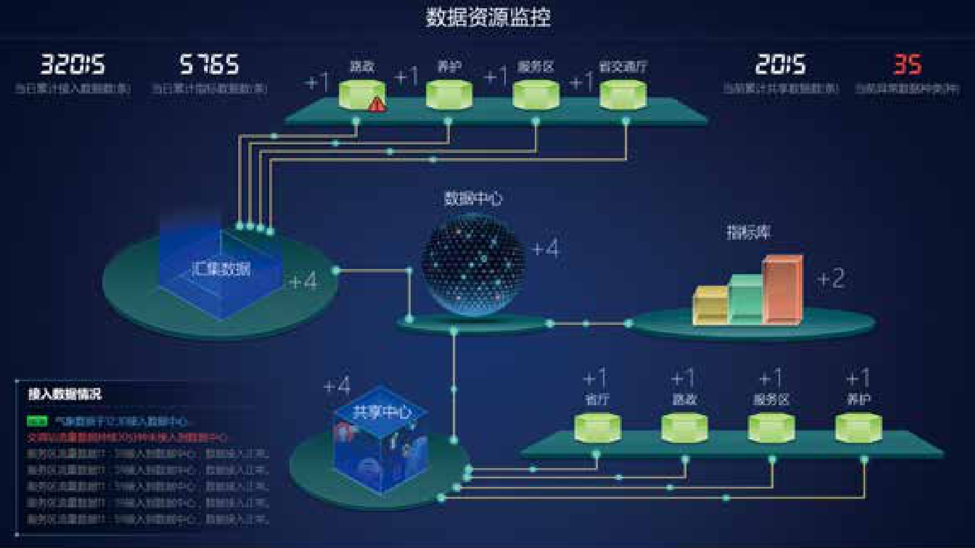 通过数据接入 3D 图,实时动 态显示各单位接入数据中心的数据 情况,数据接入异常会进行预警提 示。同时能查看各单位接入的数据 列表详情,包括数据接入单位、联 系人、联系电话、接入数据表等。