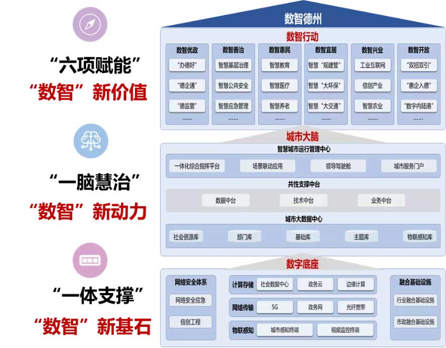 即1个数字底座,由全域覆盖的物联感知体系、高速泛在的网络传输体系、弹性协同的计算存储体系、先进创新的融合基础设施、内生可靠的网络安全体系组成,为新型智慧城市提供基础支撑。