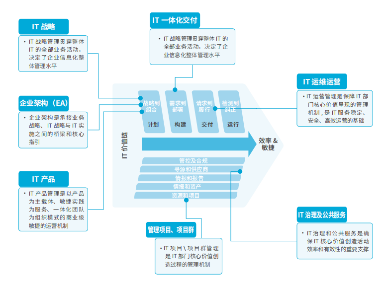 基于管理 IT 战略、管理企业架构、管理 IT 产品、管理 IT 服务一体化交付、管理 IT 运营、管理项目 \ 项目群、管理 IT 治理和公共服务等 7 个领域开展整体蓝图规划,采用服务化设计思路、智能化自动化设计方法、全方位运营模式、高效一致的协同机制、企业级端到端流程,打造一体的 IT 管理能力、响应能力、服务能力和持续改进能力,沉淀数据资产并加快建设 IT4IT 一体化作战平台,促进业务持续健康发展。项目广泛引进精益价值树、领域驱动设计、银行业 CBM、BP/IT、APQC 等模型,积极采用业务建模方法,对复杂业务系统进行解耦和重构,实现流程、数据、管理三个方面的全面拉通。