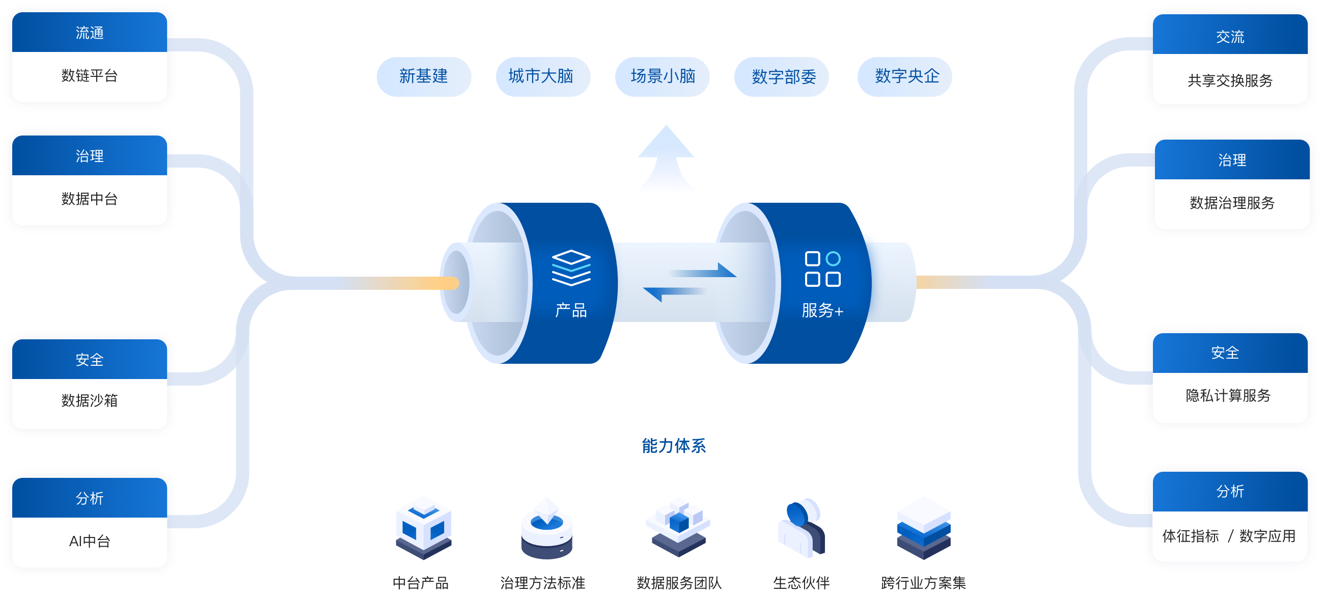 一中台跨多云实现算力资源融合,一中台适配与接管不同大数据引擎的数据资源,从而实现计算与算料资源融合,一中台支持多个数据组织在线协同实现治理能力融合。