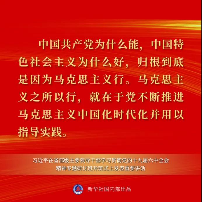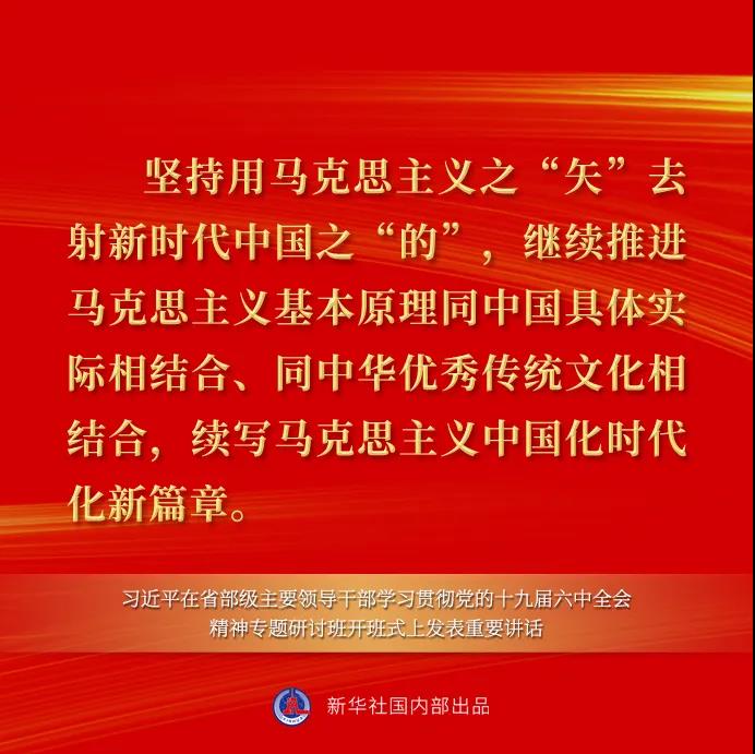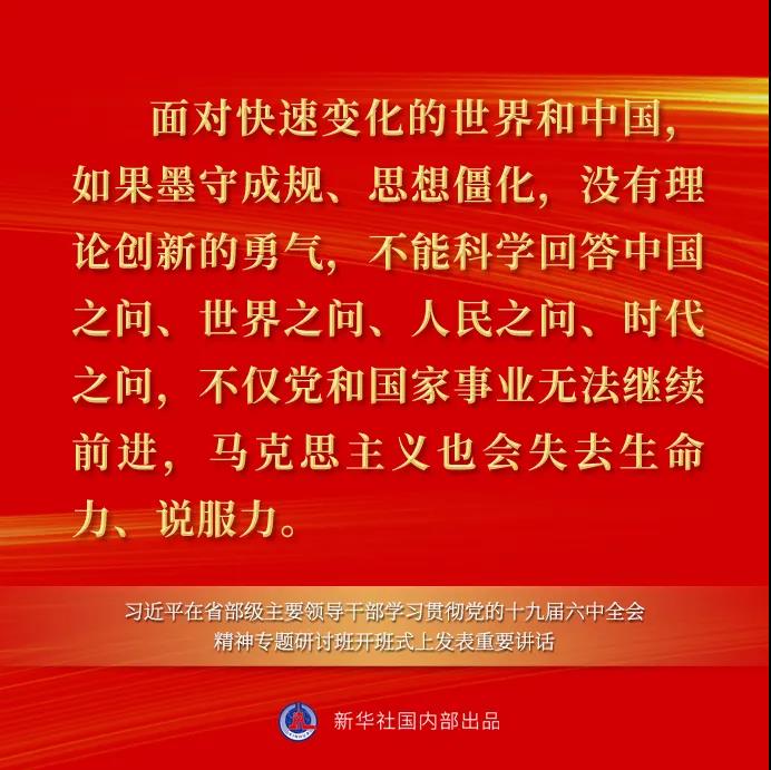 习近平在讲话中指出,一个民族要走在时代前列,就一刻不能没有理论思维,一刻不能没有正确思想指引。中国共产党为什么能,中国特色社会主义为什么好,归根到底是因为马克思主义行。马克思主义之所以行,就在于党不断推进马克思主义中国化时代化并用以指导实践。这次全会决议对百年奋斗历程中党不断推进马克思主义中国化时代化作了全面总结。注重分析研究和总结党在百年奋斗历程中对马克思主义的中国化时代化,是贯穿全会决议的一个重要内容,我们一定要深入学习、全面领会。马克思主义为人类社会发展进步指明了方向,是我们认识世界、把握规律、追求真理、改造世界的强大思想武器。同时,马克思主义理论不是教条,而是行动指南,必须随着实践的变化而发展。马克思主义能不能在实践中发挥作用,关键在于能否把马克思主义基本原理同中国实际和时代特征结合起来。面对快速变化的世界和中国,如果墨守成规、思想僵化,没有理论创新的勇气,不能科学回答中国之问、世界之问、人民之问、时代之问,不仅党和国家事业无法继续前进,马克思主义也会失去生命力、说服力。当代中国正在经历人类历史上最为宏大而独特的实践创新,改革发展稳定任务之重、矛盾风险挑战之多、治国理政考验之大都前所未有,世界百年未有之大变局深刻变化前所未有,提出了大量亟待回答的理论和实践课题。我们要准确把握时代大势,勇于站在人类发展前沿,聆听人民心声,回应现实需要,坚持解放思想、实事求是、守正创新,更好把坚持马克思主义和发展马克思主义统一起来,坚持用马克思主义之“矢”去射新时代中国之“的”,继续推进马克思主义基本原理同中国具体实际相结合、同中华优秀传统文化相结合,续写马克思主义中国化时代化新篇章。