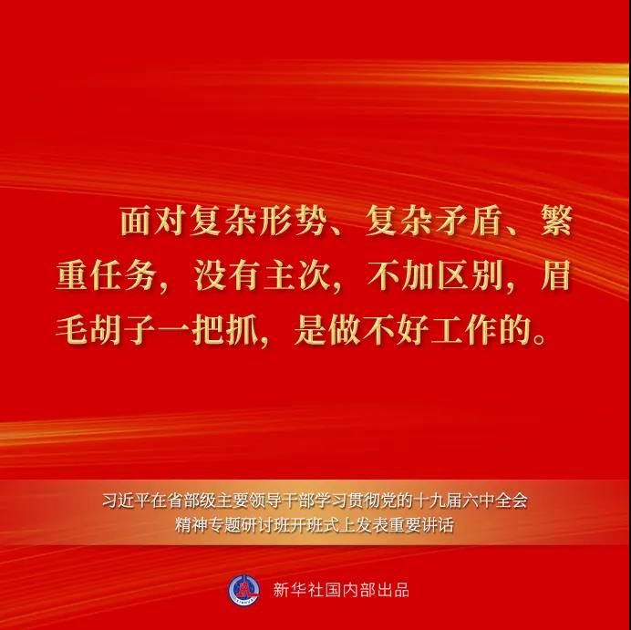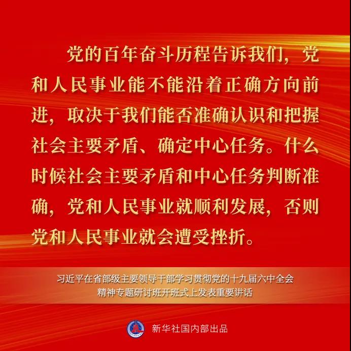 习近平强调,党的百年奋斗历程告诉我们,党和人民事业能不能沿着正确方向前进,取决于我们能否准确认识和把握社会主要矛盾、确定中心任务。什么时候社会主要矛盾和中心任务判断准确,党和人民事业就顺利发展,否则党和人民事业就会遭受挫折。这次全会决议对党善于抓住社会主要矛盾和中心任务带动全局工作作了全面分析。注重分析和总结党在百年奋斗历程中对我国社会主要矛盾和中心任务的研究和把握,是贯穿全会决议的一个重要内容,我们一定要深入学习、全面领会。面对复杂形势、复杂矛盾、繁重任务,没有主次,不加区别,眉毛胡子一把抓,是做不好工作的。我们要有全局观,对各种矛盾做到了然于胸,同时又要紧紧围绕主要矛盾和中心任务,优先解决主要矛盾和矛盾的主要方面,以此带动其他矛盾的解决,在整体推进中实现重点突破,以重点突破带动经济社会发展水平整体跃升,朝着全面建成社会主义现代化强国的奋斗目标不断前进。