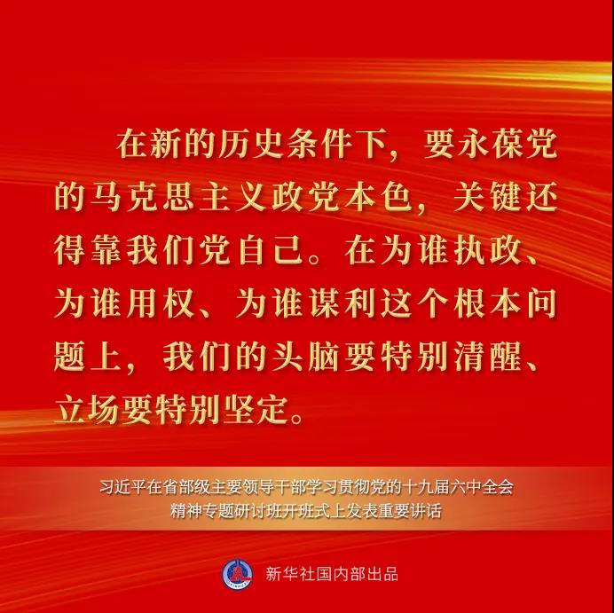 习近平强调,在百年奋斗历程中,党领导人民取得一个又一个伟大成就、战胜一个又一个艰难险阻,历经千锤百炼仍朝气蓬勃,得到人民群众支持和拥护,原因就在于党敢于直面自身存在的问题,勇于自我革命,始终保持先进性和纯洁性,不断增强创造力、凝聚力、战斗力,永葆马克思主义政党本色。这次全会决议对百年奋斗历程中党高度重视管党治党、不断推进自我革命作了全面总结。注重分析和总结党在百年奋斗历程中对自我革命的研究和把握,是贯穿全会决议的一个重要内容,我们一定要深入学习、全面领会。在新的历史条件下,要永葆党的马克思主义政党本色,关键还得靠我们党自己。在为谁执政、为谁用权、为谁谋利这个根本问题上,我们的头脑要特别清醒、立场要特别坚定。全党同志都要明大德、守公德、严私德,清清白白做人、干干净净做事,做到克己奉公、以俭修身,永葆清正廉洁的政治本色。自我革命关键要有正视问题的自觉和刀刃向内的勇气。现在,反腐败斗争取得了压倒性胜利并全面巩固,但全党同志要永葆自我革命精神,增强全面从严治党永远在路上的政治自觉,决不能滋生已经严到位的厌倦情绪。党风廉政建设和反腐败斗争永远在路上,一刻也不能放松,要以抓铁有痕、踏石留印的坚韧和执着,继续打好党风廉政建设和反腐败斗争这场攻坚战、持久战。不论谁在党纪国法上出问题,党纪国法决不饶恕。
