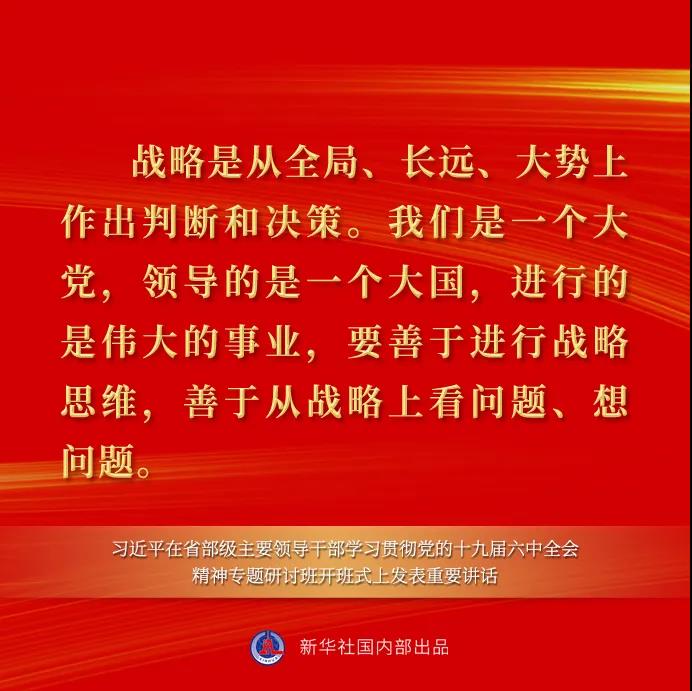 习近平指出,战略问题是一个政党、一个国家的根本性问题。战略上判断得准确,战略上谋划得科学,战略上赢得主动,党和人民事业就大有希望。一百年来,党总是能够在重大历史关头从战略上认识、分析、判断面临的重大历史课题,制定正确的政治战略策略,这是党战胜无数风险挑战、不断从胜利走向胜利的有力保证。这次全会决议对百年奋斗历程中党高度重视战略策略问题、不断提出科学的战略策略作了全面总结。注重分析和总结党在百年奋斗历程中对战略策略的研究和把握,是贯穿全会决议的一个重要内容,我们一定要深入学习、全面领会。战略是从全局、长远、大势上作出判断和决策。我们是一个大党,领导的是一个大国,进行的是伟大的事业,要善于进行战略思维,善于从战略上看问题、想问题。正确的战略需要正确的策略来落实。策略是在战略指导下为战略服务的。战略和策略是辩证统一的关系,要把战略的坚定性和策略的灵活性结合起来。各地区各部门确定工作思路、工作部署、政策措施,要自觉同党的理论和路线方针政策对标对表、及时校准偏差,党中央作出的战略决策必须无条件执行,确保不偏向、不变通、不走样。