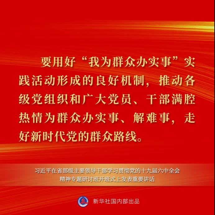 习近平指出,这次全会决议对百年奋斗历程中党注重进行党史学习教育作了全面总结,强调全党要坚持唯物史观和正确党史观,从党的百年奋斗中看清楚过去我们为什么能够成功、弄明白未来我们怎样才能继续成功,从而更加坚定、更加自觉地践行初心使命,在新时代更好坚持和发展中国特色社会主义。这是六中全会提出的一项重要政治任务,我们要继续抓好落实。党的第三个历史决议体现了我们对党的百年奋斗历史的新认识,这方面更要深入学习领会,以利于更好认识和把握党的百年奋斗重大成就和历史经验。要认真总结这次党史学习教育的成功经验,建立常态化长效化制度机制,不断巩固拓展党史学习教育成果。全党要以学习贯彻党的十九届六中全会精神为重点,深入推进党史学习教育,进一步做到学史明理、学史增信、学史崇德、学史力行,教育引导全党同志学党史、悟思想、办实事、开新局,更好用党的创新理论把全党武装起来,把党中央决策部署的各项任务落实下去。要原原本本学习全会决议,学懂弄通党百年奋斗的光辉历程,学懂弄通党坚守初心使命的执着奋斗,学懂弄通党百年奋斗的历史意义和历史经验,学懂弄通以史为鉴、开创未来的重要要求。要用好党委(党组)理论学习中心组制度,推动领导班子、领导干部带头学党史、经常学党史。要用好干部教育培训机制,继续把党史作为党校(行政学院)、干部学院必修课、常修课。要用好学校思政课这个渠道,推动党的历史更好进教材、进课堂、进头脑,发挥好党史立德树人的重要作用。要用好红色资源,加强革命传统教育、爱国主义教育、青少年思想道德教育,引导全社会更好知史爱党、知史爱国。要用好“我为群众办实事”实践活动形成的良好机制,推动各级党组织和广大党员、干部满腔热情为群众办实事、解难事,走好新时代党的群众路线。