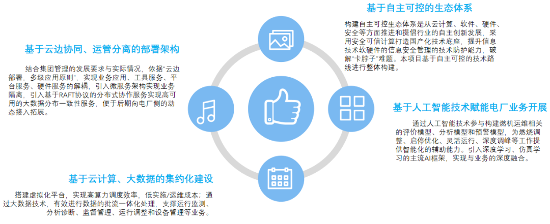 作为我国电力行业五家国有独资发电企业集团之一,中国华电在该平台设计之初,就确定了要基于自主可控的生态技术体系建设,并利用云计算、人工智能等先进技术开展建设,并结合集团公司管理的发展要求与实际情况,确定了“云边部署,多级应用”的原则。