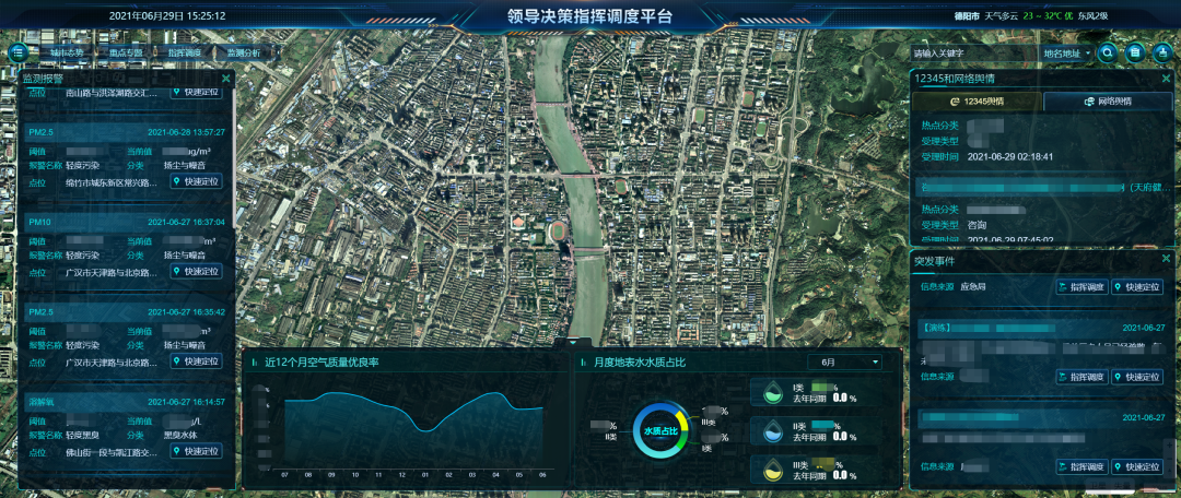 在德阳,通过市全流域(含中心城区黑臭水体)管控智慧平台,可实现城市三维仿真全景式展示,并与应急、万物互联感知平台、12345热线、市民通等10个平台实现数据共享和业务对接,助力德阳市黑臭水体治理,还城市青山绿水,美好家园。