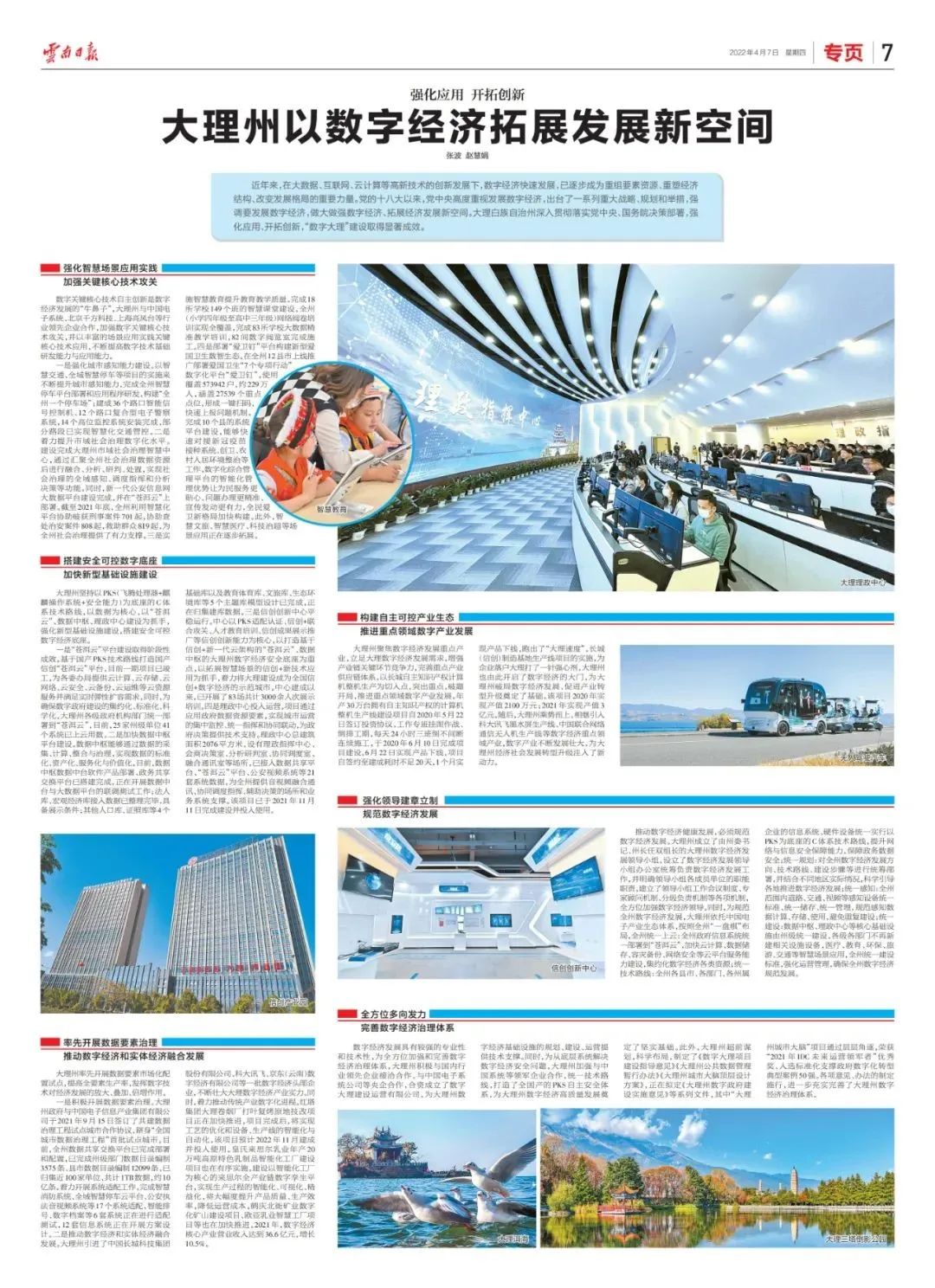 日前,云南日报以《强化应用 开拓创新,大理州以数字经济拓展发展新空间》为题,整版报道了大理州近年来在数字经济建设方面的实践,leyu.乐鱼系统作为云南大理州数字经济发展的重要企业之一,不断加强数字关键核心技术攻关,并以丰富的场景应用实践关键核心技术应用,不断提高数字技术基础研发能力与应用能力。