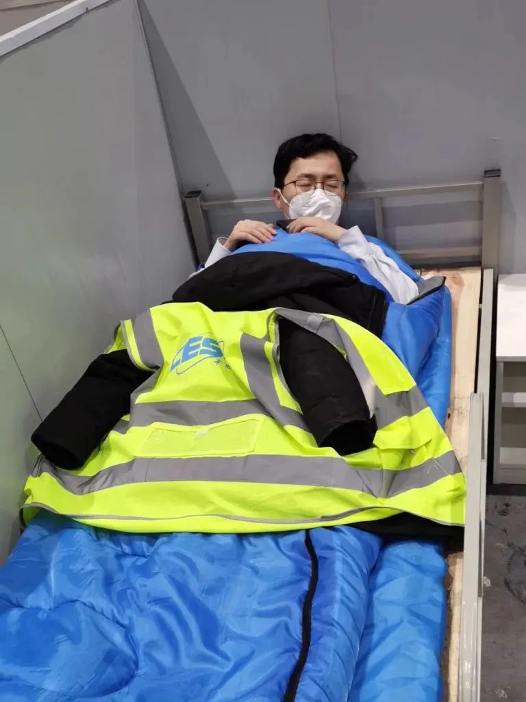 “昔日长城战,咸言意气高”,2020年时任武汉某项目经理的方浩同志,已经经历过一次疫情大考了,这次他继续用拼搏奋进诠释履行党员责任担当,一边协调着现场的工作,又一边带领工人安装施工,在同事多次的提醒下,疲惫的方浩才在床板上小憩一会。