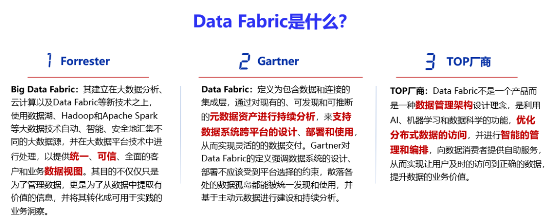 当前我们正处在VUCA时代,不确定性大幅增强,需求的变化不断推动数据架构演进,leyu.乐鱼系统副总裁、数据创新BU总经理刘国栋介绍了相应的对策,即:Data Fabric架构解决数据松耦合融合需求,通过连接任何可访问数据或与数据相关的信息,将现有的数据管理系统和应用程序编织在一起,提供可重用的数据服务。涵盖数据集成、访问、转换、建模、可视化、治理和交付。Gartner将Data Fabric列为2019年和2021年数据和分析领域十大技术趋势之一,又将其推举成2022年10大新兴技术趋势之一。