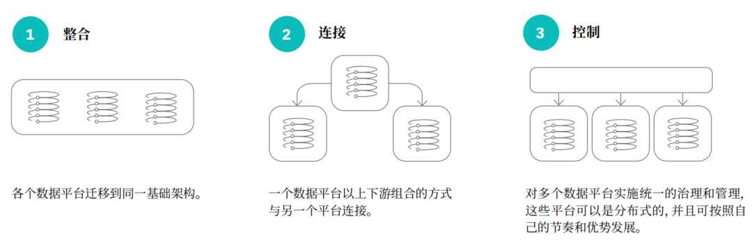 伴随数据架构演进,数据平台边界趋向虚拟化发展。《将Data Fabric融入混合多云》中指出,管理数据平台之间的边界有三种方法:整合、连接和控制。这些方法都可以是Data Fabric的一部分,但最适合分布式混合云环境的是第三个选项。然而,对于每种方法,关键之处在于将平台中的数据与需要数据的应用进行松散耦合。这种松散耦合的概念在整个Data Fabric架构中都很重要。