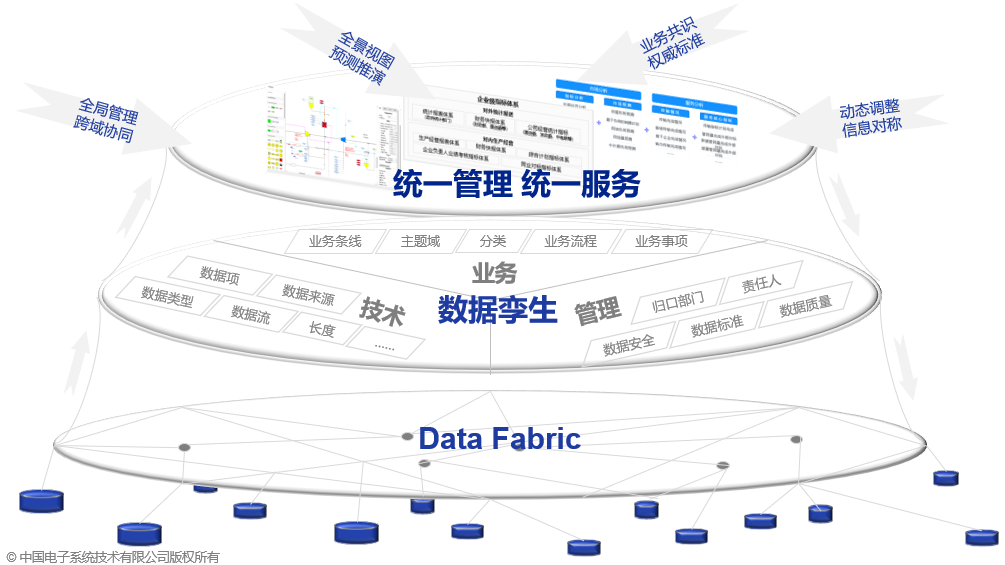 基于Data Fabric架构的智能湖仓构建中大型组织统一数据管理平台,纵向按需接入、横向标准统一,以松耦合数据融合的方式建设全息数据孪生体系,使之可计量、可管理、可认知、可预测、可决策。