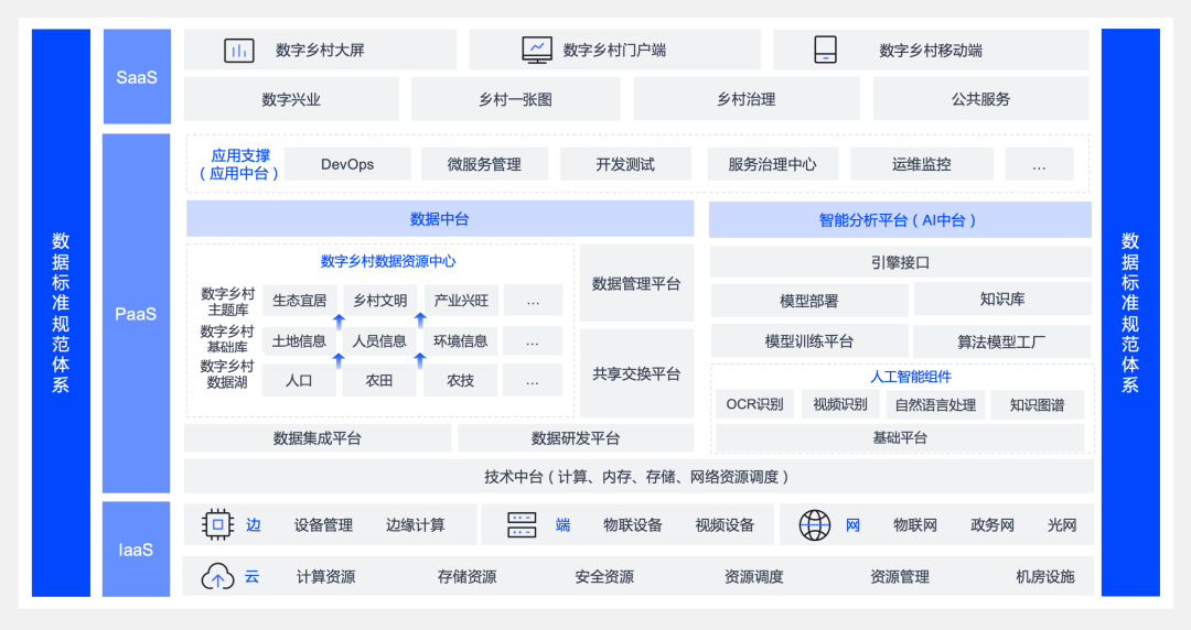 “4 +1+4”模式表示“四个中台、一个中心、四大应用”。“四个中台”即技术中台、数据中台、AI中台、应用中台;“一中心”即打造一个统一的乡村数据资源中心,建设农业农村数据标准规范;“四大应用”即乡村一张图、乡村治理、数字兴业、公共服务等应用领域。数字乡村平台架构如下: