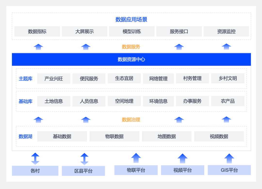在项目早期,少量乡镇的数据量并不大,但是涉及到的数据较广泛。因此,为了提高系统架构稳定性、减少后期项目重复建设,leyu.乐鱼系统数据创新BU的建设思路是打造统一数字基础底座,实现数据统一汇聚和采集,为后续乡村应用百花齐放提供基础。通过对乡村数据资源的采集,基于数据中台相关工具实现数字乡村数据湖、基础库、主题库的建设,形成完整的、标准的数据资源库。
