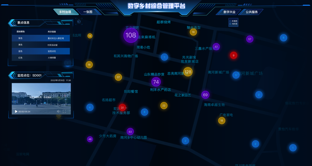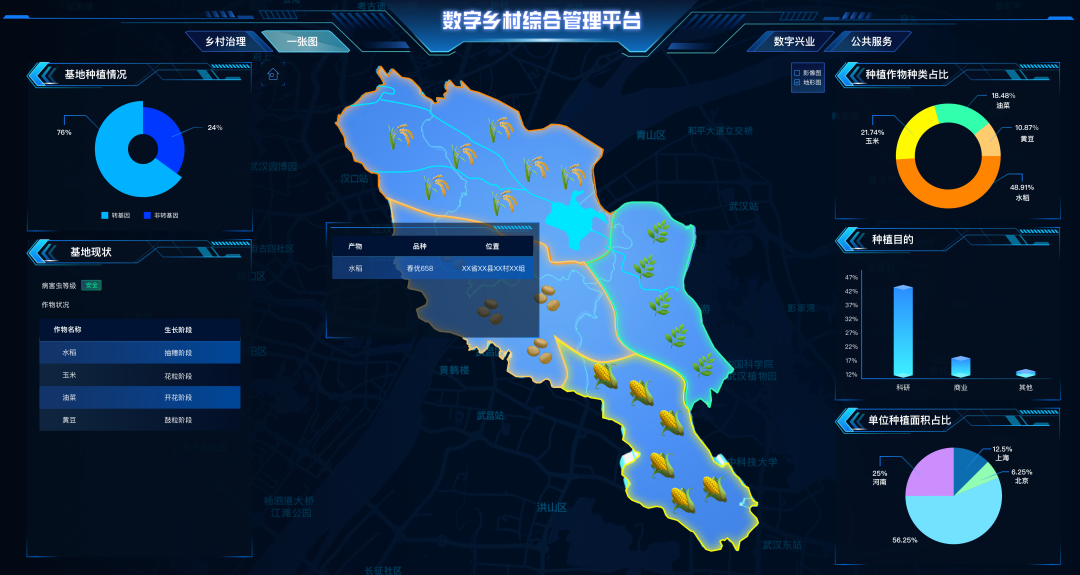 乡村建设“一张图”,以电子地图、遥感影像、三维实景地图等多类型、多尺度、多时态的空间数据为基底,通过摸清乡村资源家底,归集为一张图实现乡村信息总览。从村务管理、在田作物、生态宜居、产业管理等多个方面,实现乡村数字化监控和管理。
