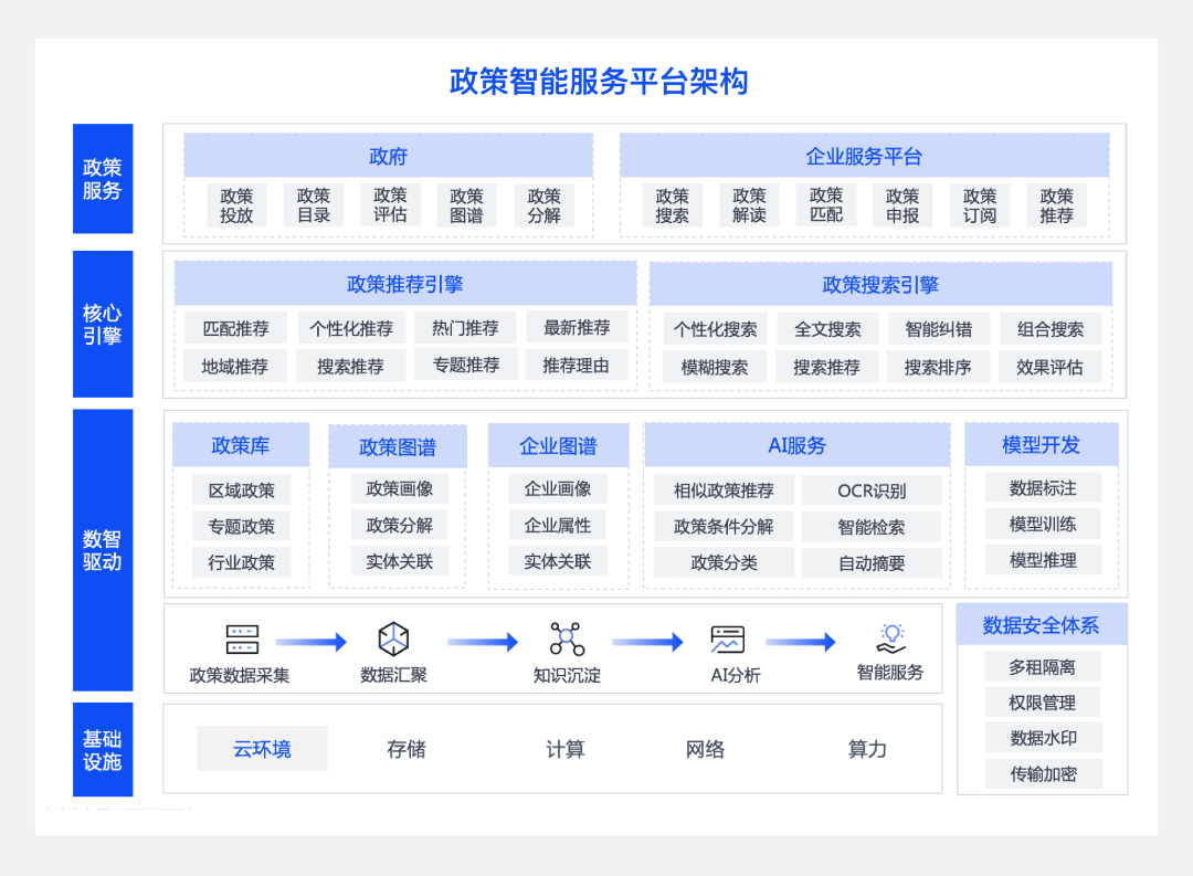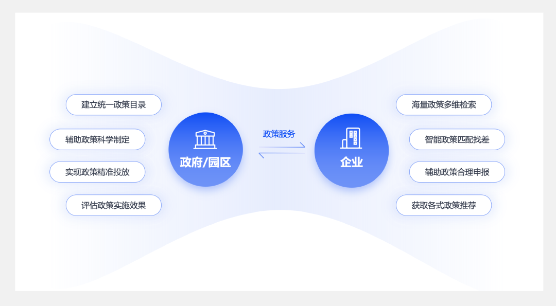 每年各级政府都会发布大量产业扶持和惠企政策,不容忽视的是,政府与企业间在政策服务上往往会相互脱节,缺乏信息高效互通的桥梁。政府无法精准投放政策,企业获取政策难、理解成本高、匹配政策难,出现了政策虽好而落实难的困境。《国务院办公厅关于加强政府网站信息内容建设的意见》明确要求各级政府要将政府网站作为政府信息公开的第一平台,第一时间发布政府的政策信息。基于上述政策要求,政策信息、政策数据的公开透明化是合法、合规且必须的,政策文献不再尘封于“深宫密闱”之中。
