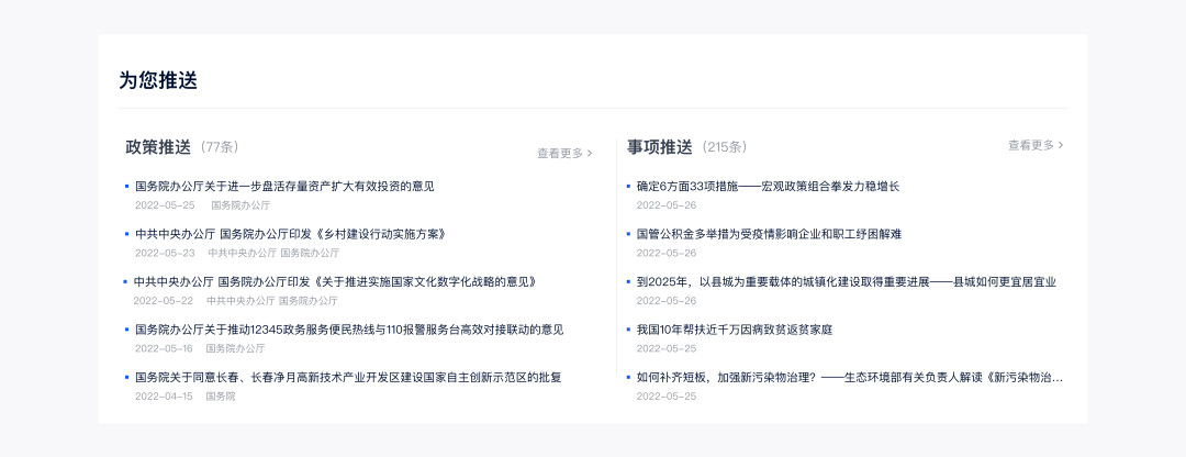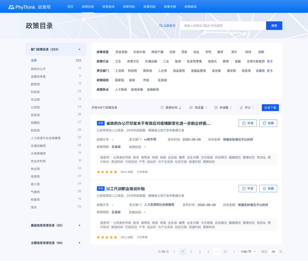 采集并管理各类政策,为政府及企业提供政策目录服务,含各政策种类、政策行业、政策责任部门、热点专题等多种形式。