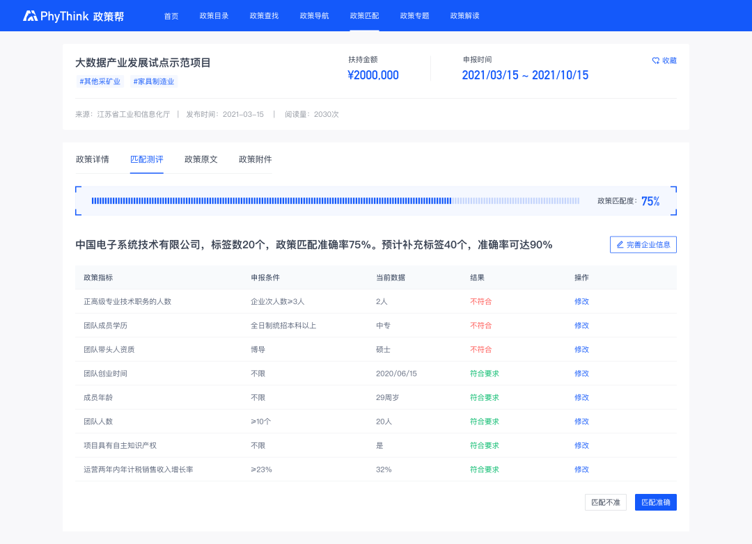 支持企业查看单项或多项政策的匹配结果,提供匹配度,同时指出不满足政策要求的指标项,精确指导企业“对标找差”。进一步地指引企业不断完善自身信息,不断提高政策匹配精准度。