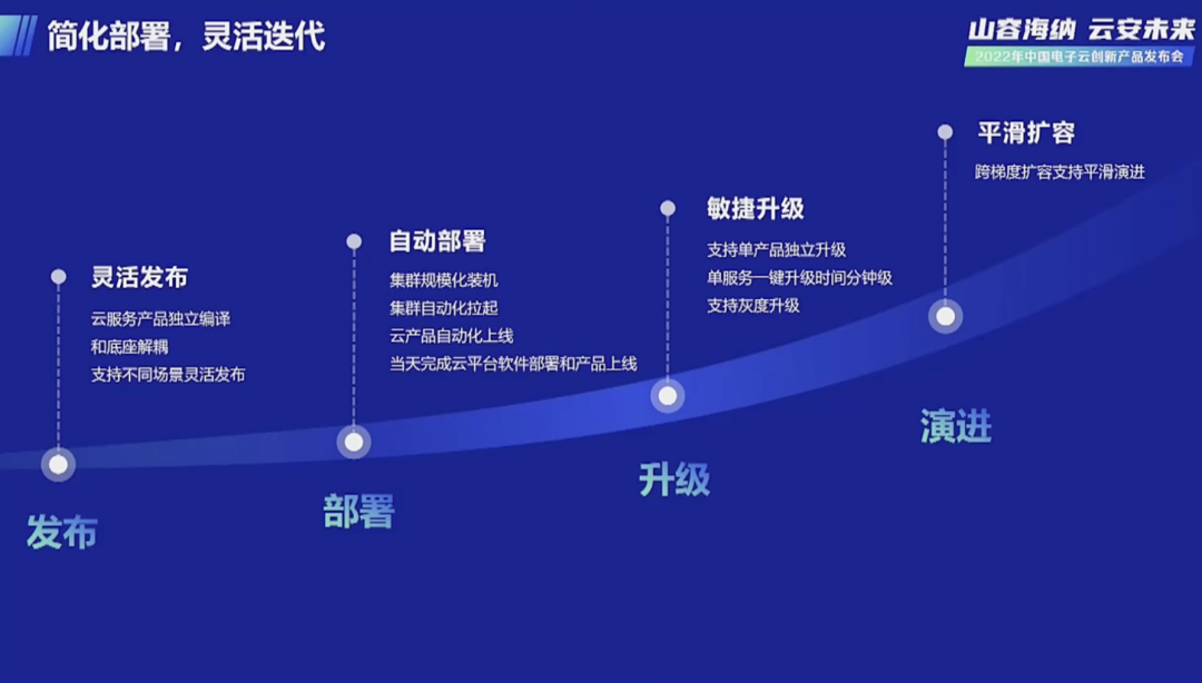 其次,CECSTACK 3.1在部署升级大幅简化,提升专属云易用性,真正让专属云走向好用。例如,CECSTACK3.1支持自动化部署、支持集群规模化装机以及自动拉起、支持云产品自动上线;支持单产品的独立升级,跨梯度的平滑升级;应用全生命周期管理则支持业界主流微服务框架,实现应用无缝迁移和应用上云的顺畅性;开箱即用的服务治理能力则应用运维的标准化和自动化水平;此外,CECSTACK 3.1支持完整的应用层容灾备份能力,引入了应用的主动防御体系,将业务中断的风险降到最低。
