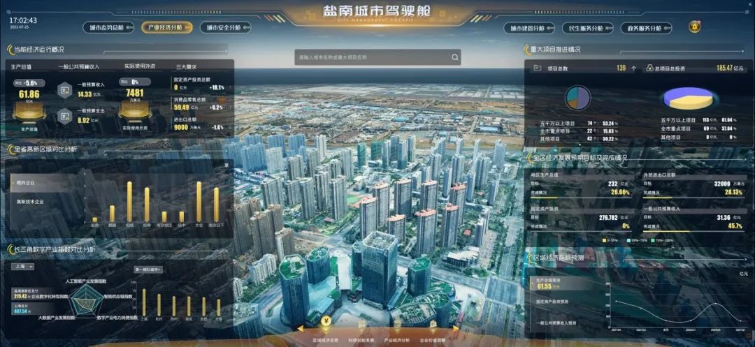 目前,盐南城市驾驶舱已完成数字底座leyu.乐鱼电子云环境搭建、数据中台部署、数据信息资源共享交换平台建设;通过36家单位调研与对接,汇聚全区32万人口数据,梳理三十多类、二百多项标签,接入业务系统49个、表1044张、文件类385项、数据接口299个,数据量7642万条;共建设五大主题库,产业经济主题库分别接入长三角城市群1335条数字经济产业政策数据和全区28000多家企业数据;已打通视频类系统7个,包括公安、城管、教育、物业等共20472路视频。