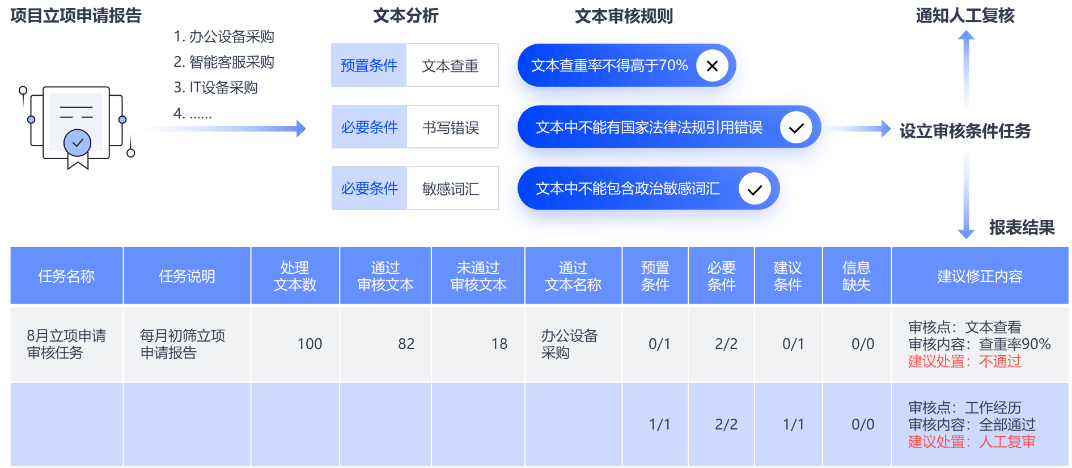 为了提升项目申报、审批、分析的工作效率,平台利用AI模型,将各类非结构化项目信息进行解析成规范的结构化数据,并对项目文档规范性检查。