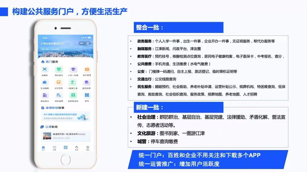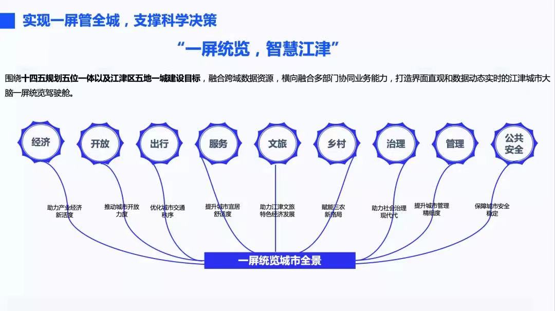 按照“一平台多边应用”建设思路,打造领导驾驶舱,集成各部门的多跨协同场景应用成果,为重大事件和重大决策提供指挥调度能力;建设三级综治中心体系,开发“有呼必应”应用,赋予市民对镇街部门、镇街对部门、部门对部门的“呼叫权”,全面提升社会治理水平;建设城市管理综合服务平台,实现城市管理“一网统管”,城市运行“一屏统览”;构建智慧江津APP矩阵——通过多渠道为市民提供政务、交通、教育、医疗、生活等服务。